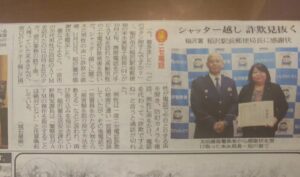 11月13日の中日新聞尾張版で、シャッター越しに詐欺を見抜き、稲沢署から稲沢駅前郵便局の末永局長に感謝状を贈呈した内容の記事がありました。